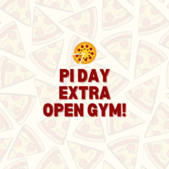 Join us for an extra Pi Day Open Gym on Friday, March 14th from 12:00 PM – 1:30 PM! For just $15 per student, your gymnast can practice their skills and enjoy some delicious pizza pie afterward! π